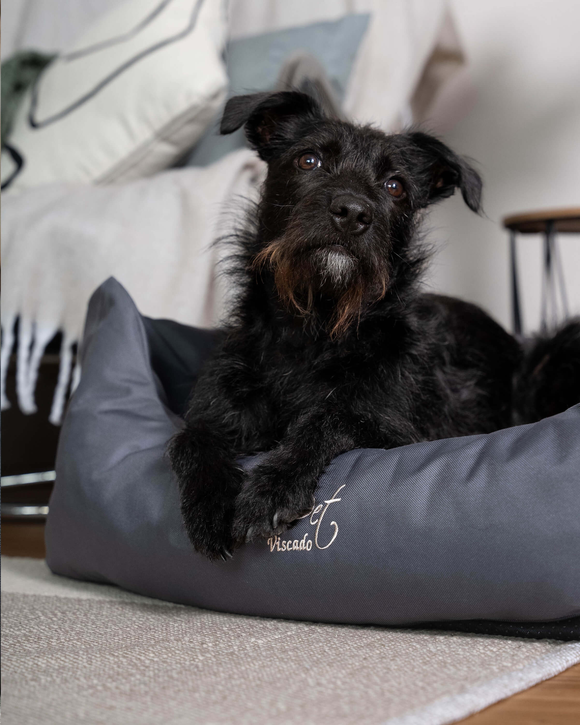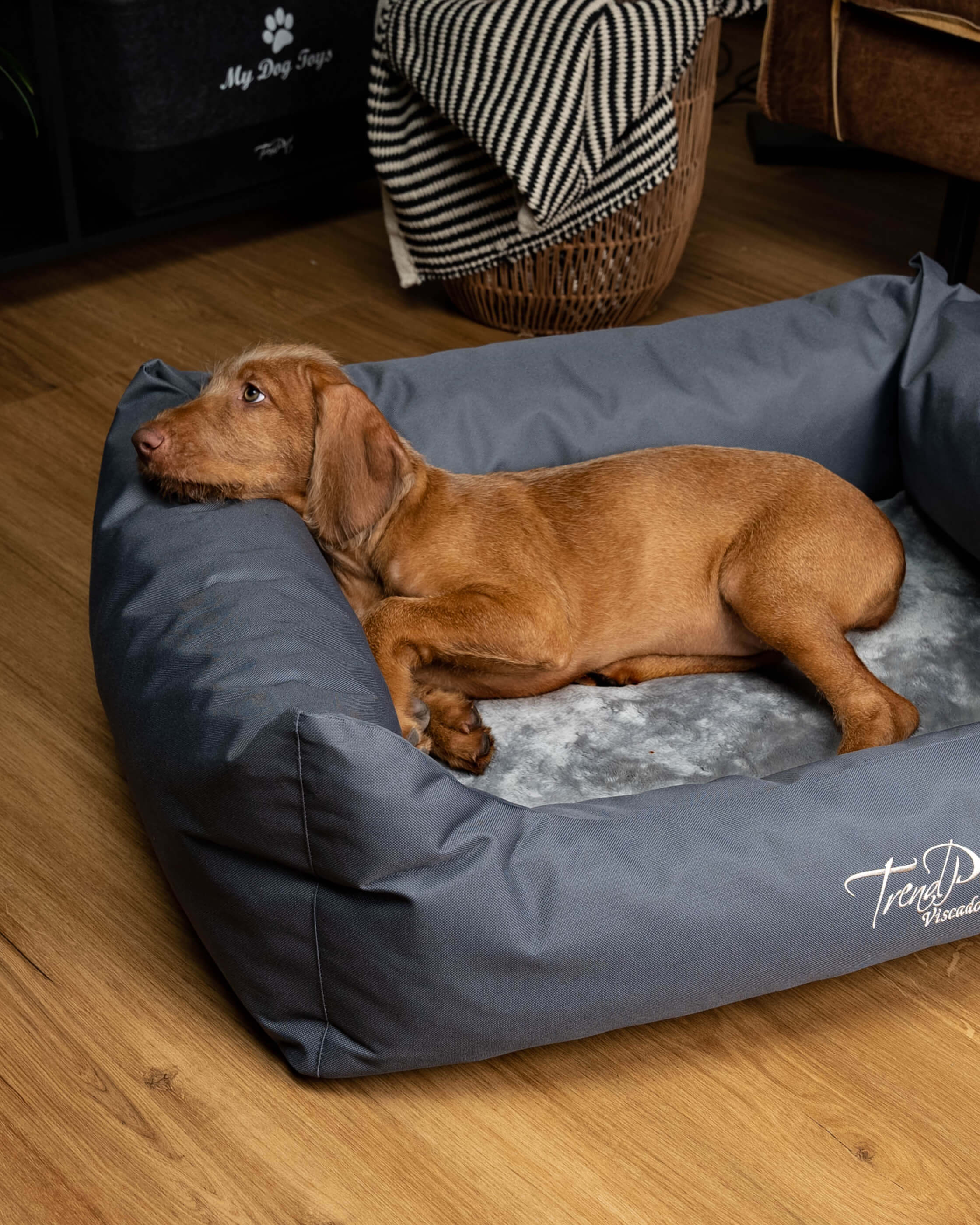 Gönn deinem treuen Begleiter den Schlafkomfort, den er verdient! Das Viscado Hundebett vereint modernes Design mit höchstem Wohlfühlfaktor – perfekt für alle Fellnasen, die es gerne gemütlich haben. Die 5 cm starke viskoelastische Wendematratze passt sich optimal an den Körper deines Hundes an und entlastet Gelenke und Wirbelsäule – ideal auch für ältere oder empfindliche Hunde. Der extra hohe, weich gefüllte Rand lädt zum Anlehnen und Kuscheln ein und dient gleichzeitig als bequeme Kopfauflage.Der strapazierfähige, wasserabweisende Bezug in elegantem Grau sieht nicht nur stilvoll aus, sondern ist auch pflegeleicht – einfach abziehbar und waschbar. So bleibt das Bett lange schön und hygienisch.