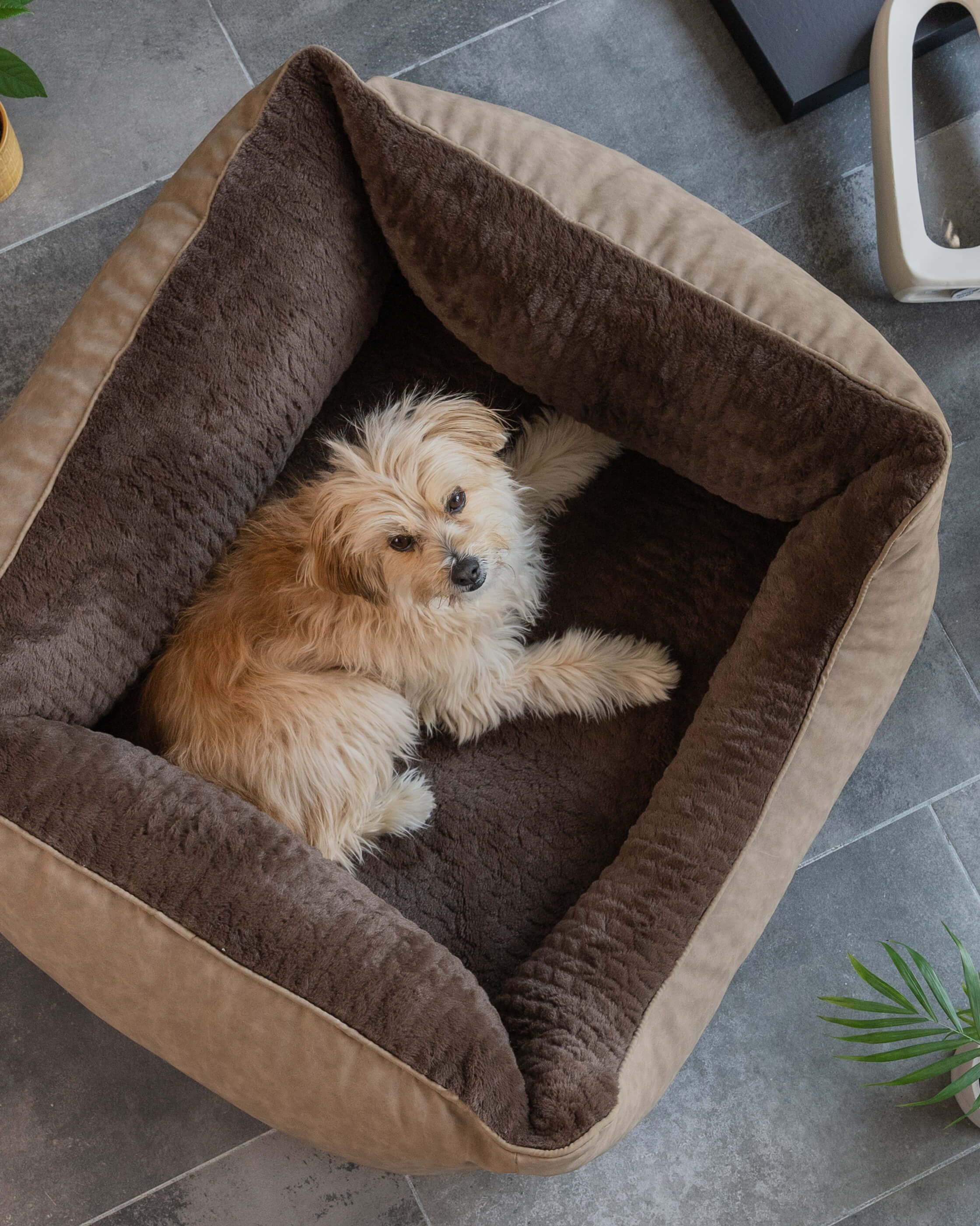 Außen zeigt sich das VitaBed Style in edler Kunstlederoptik, innen überzeugt es mit kuschelig weichem Stoff – bekannt aus den Heaven-Decken von TrendPet. Die Kombination sorgt für ein stilvolles Erscheinungsbild und höchsten Wohlfühlkomfort für deine Fellnase.