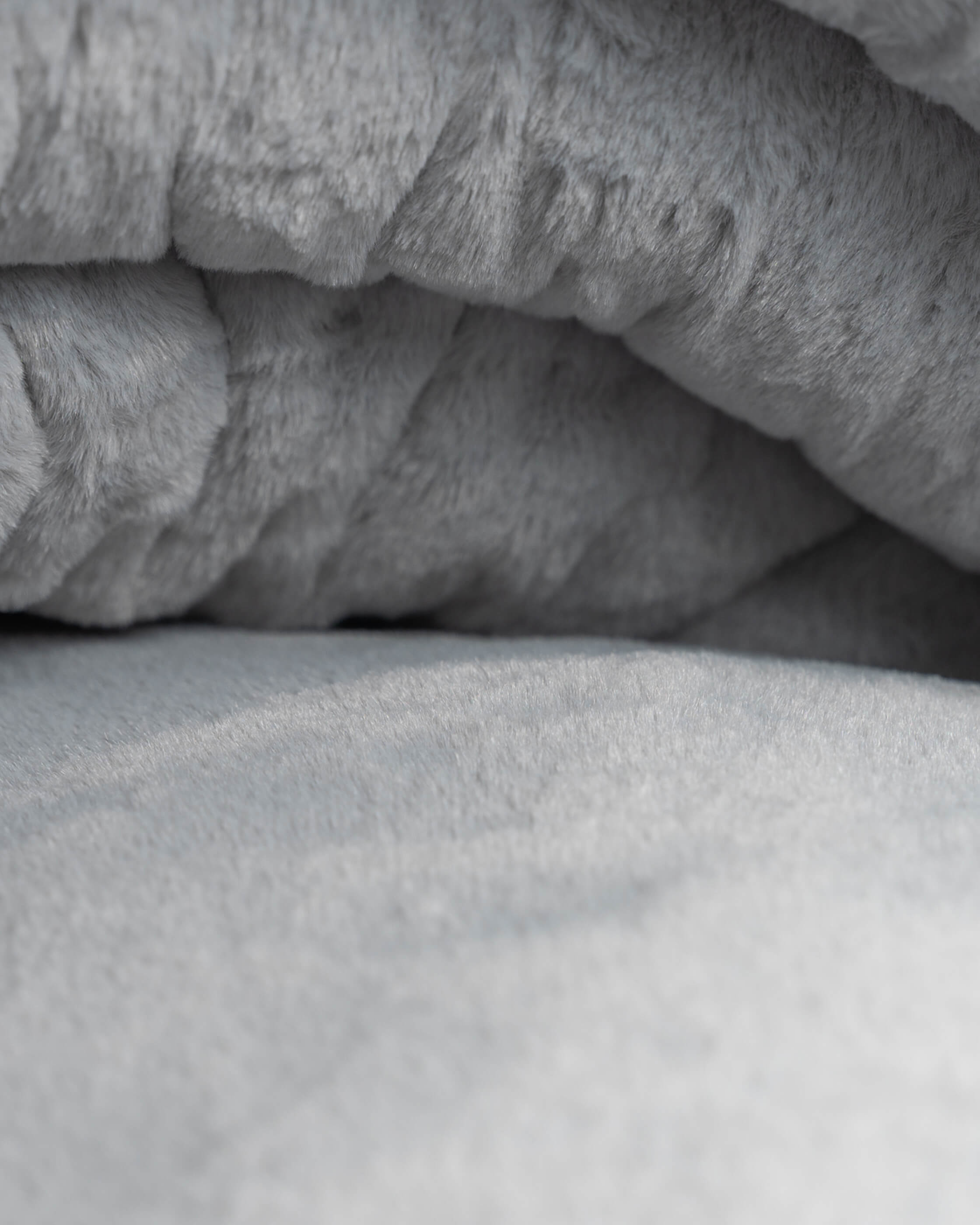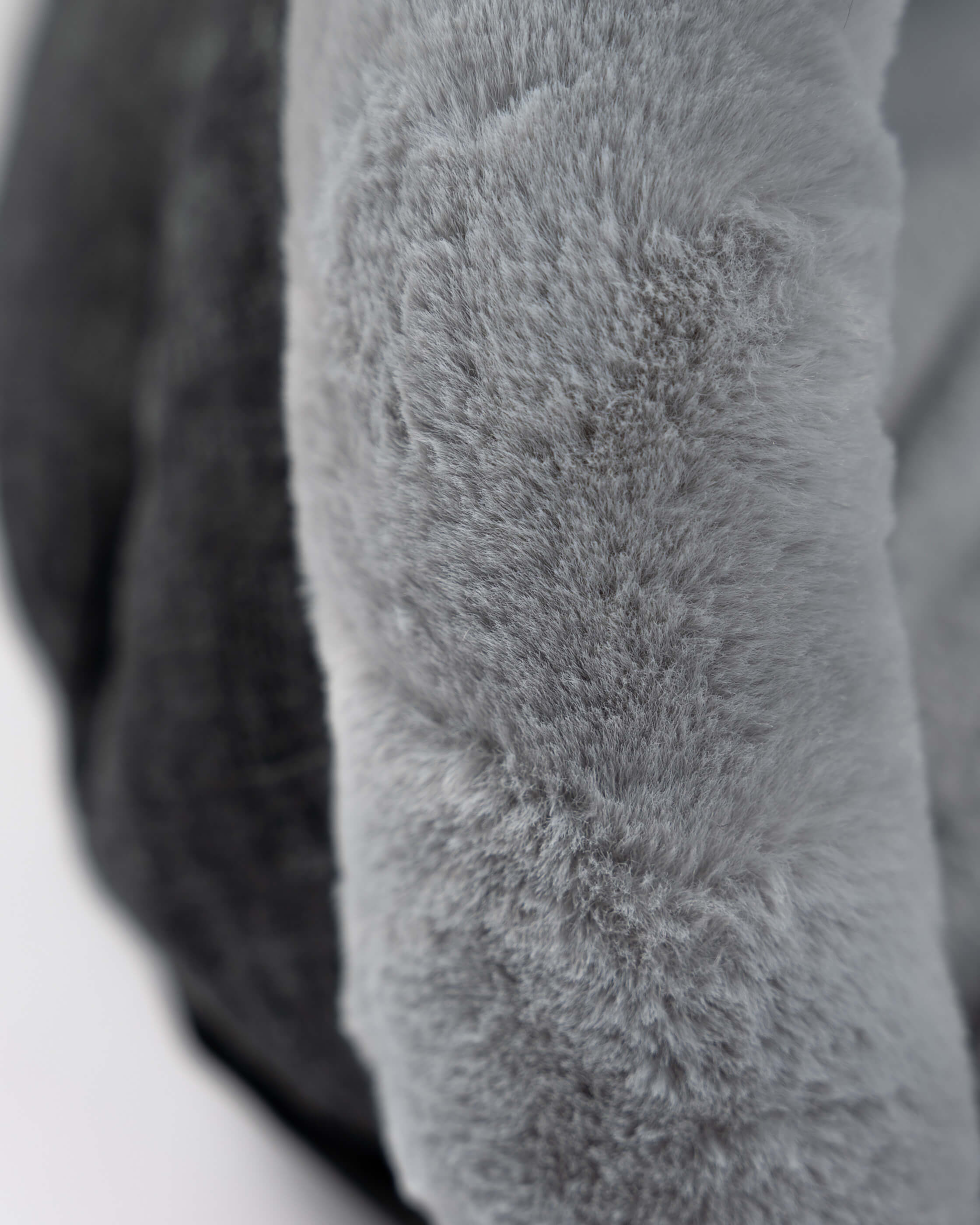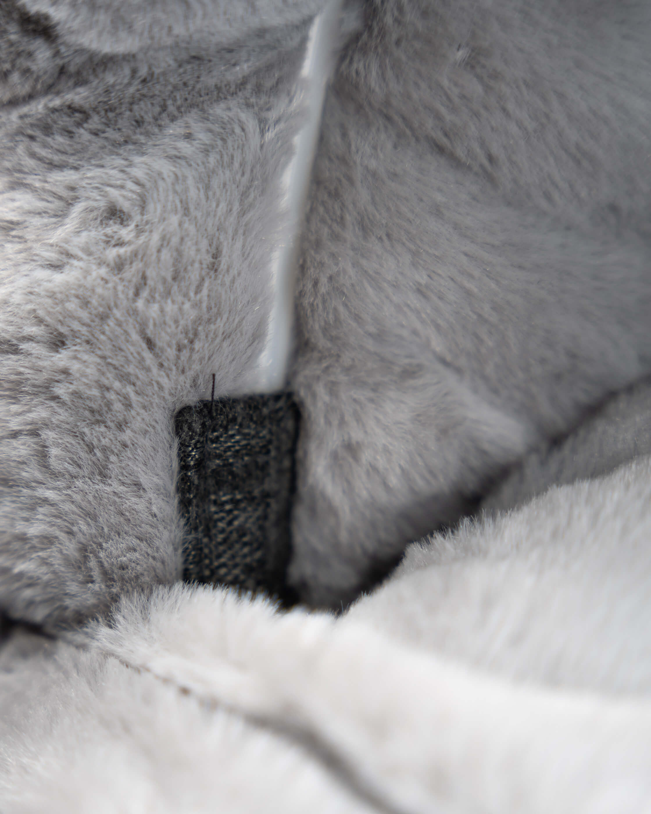 - Innen flauschig weich, außen ein grau gemusterter Strukturstoff
