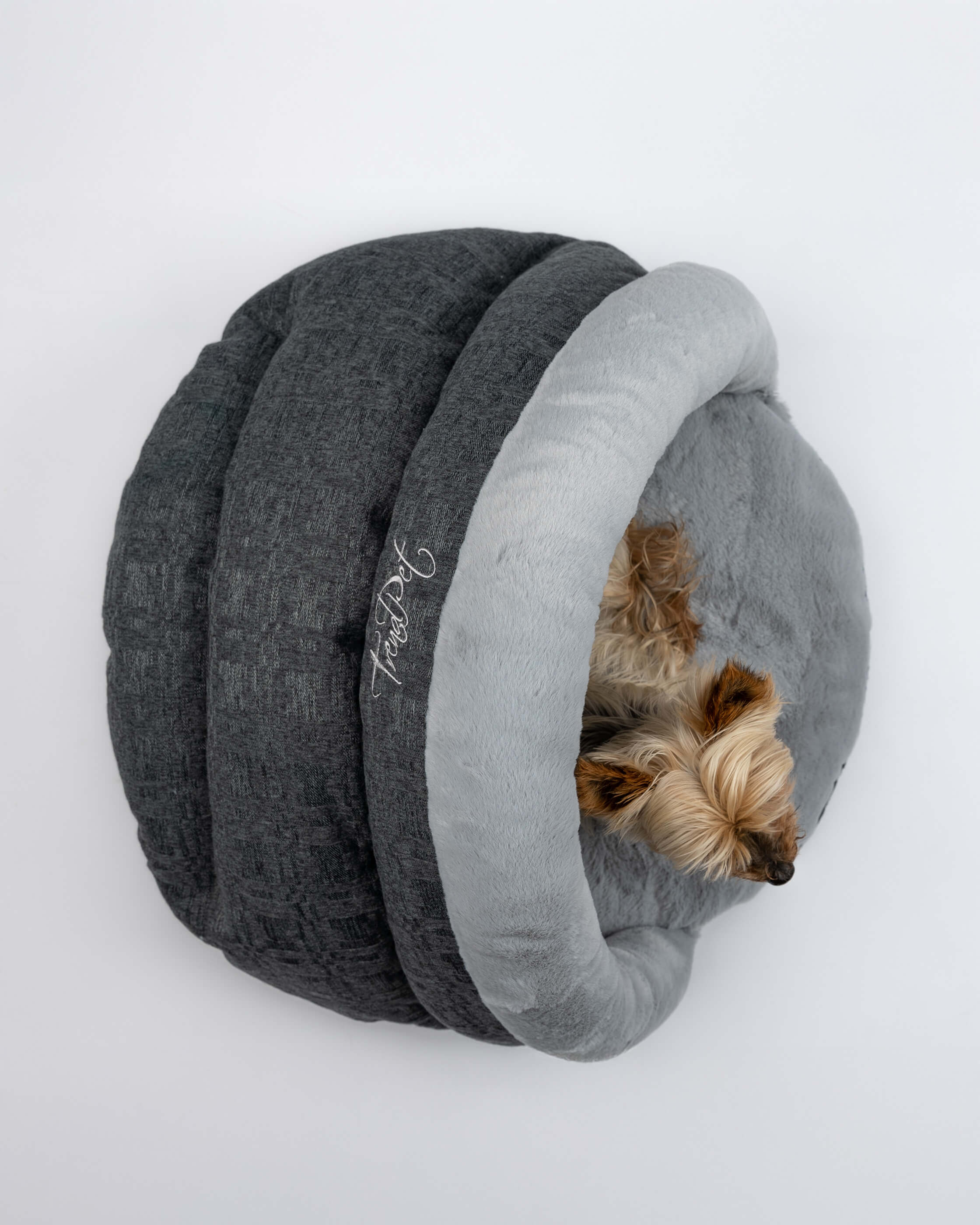 Die nach hinten zulaufende Öffnung und die innenlaufende Zeltstange bieten extra Stabilität und einen geschützten Rückzugsort – ideal für kleine Hunde und Katzen, die Geborgenheit lieben. Der grau gemusterte Außenstoff kombiniert mit dem flauschigen Innenfutter macht das Bett gleichzeitig zu einem stilvollen Highlight in deinem Zuhause.