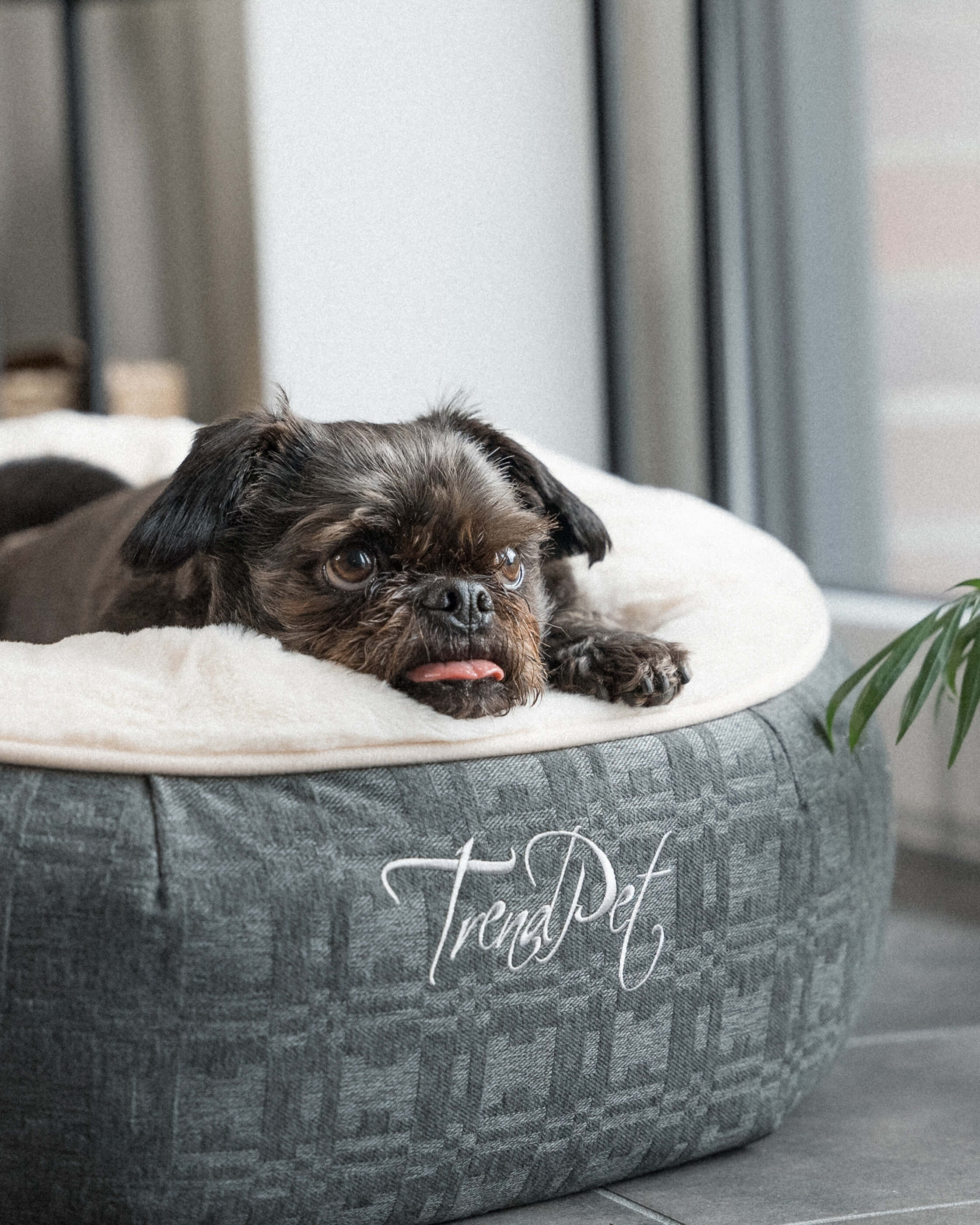 Das herausnehmbare, beidseitig verwendbare Kissen bietet zusätzlichen Komfort und lässt sich im Handumdrehen anpassen – mal flauschig, mal glatt, ganz nach den Vorlieben deiner Fellnase. Der grau gemusterte Außenstoff kombiniert mit dem weichen Innenflausch verleiht dem LunaBed einen eleganten Look, der in jedes Zuhause passt.