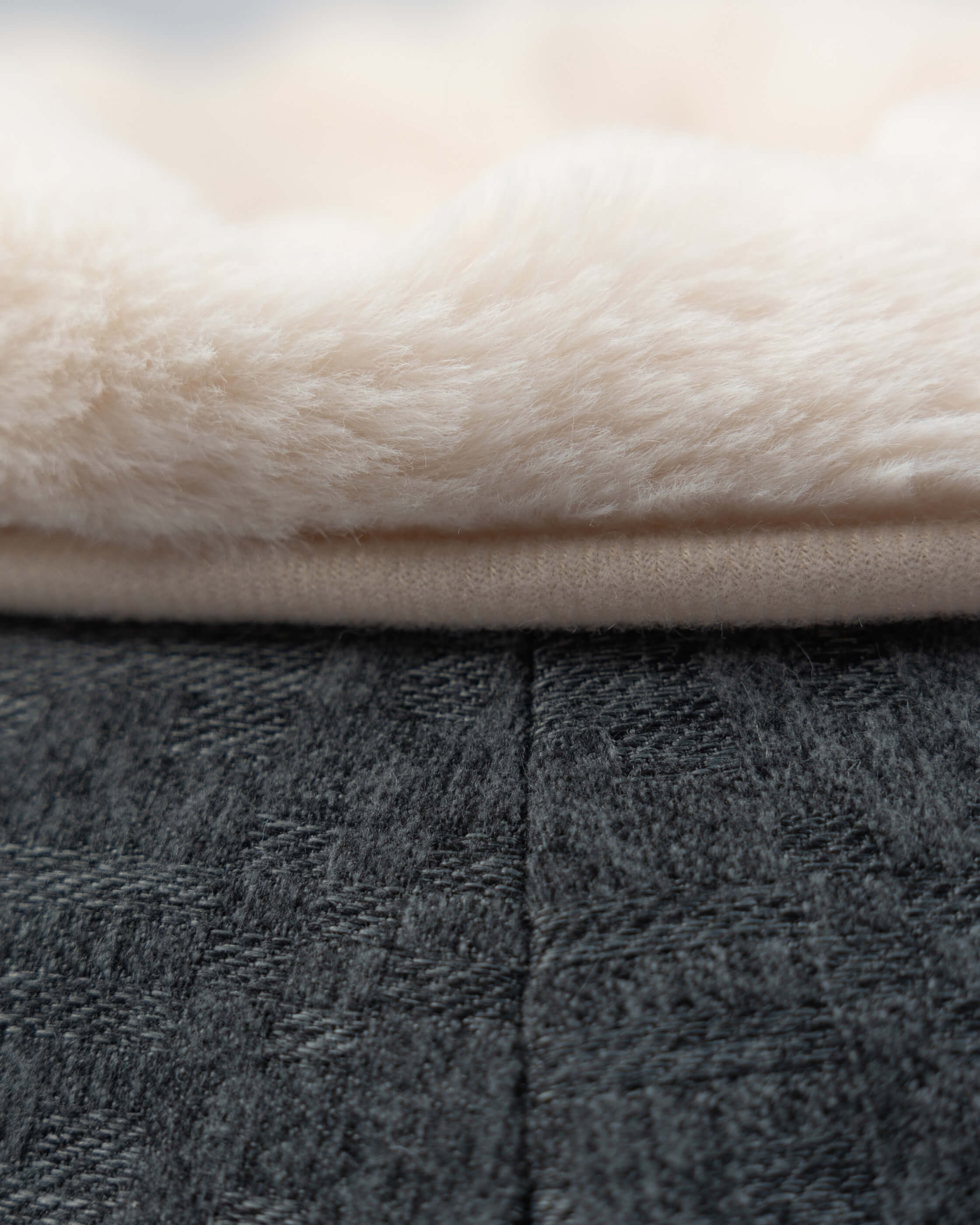 Das Innenkissen des Bettes ist wendbar. Auf der einen Seite ist es flauschig, wie der kuschelige Bezug des Außenbezugs. Die andere Seite ist mit dem Strukturstoff des Bettes ausgestattet.