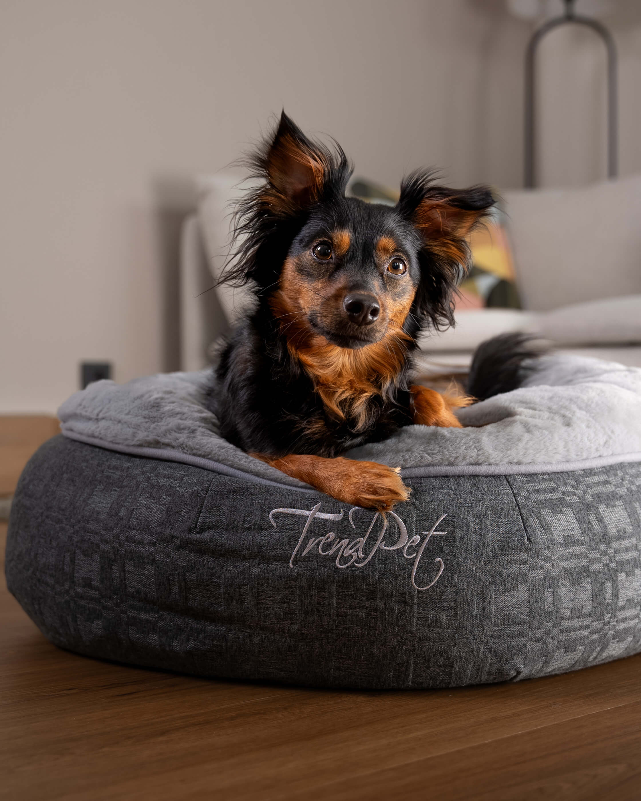 Das herausnehmbare, beidseitig verwendbare Kissen bietet zusätzlichen Komfort und lässt sich im Handumdrehen anpassen – mal flauschig, mal glatt, ganz nach den Vorlieben deiner Fellnase. Der grau gemusterte Außenstoff kombiniert mit dem weichen Innenflausch verleiht dem LunaBed einen eleganten Look, der in jedes Zuhause passt.