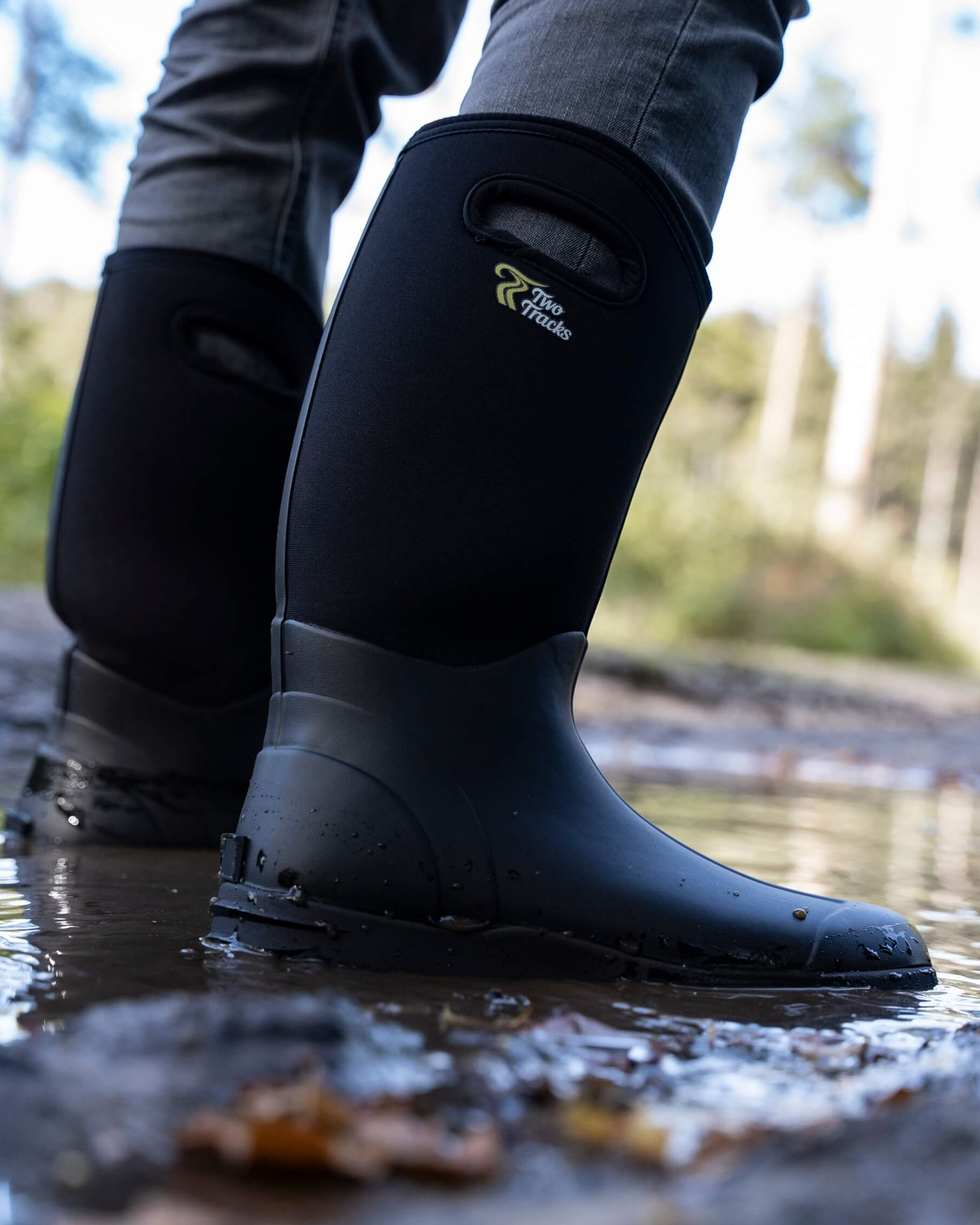 Die Neoprenstiefel von TwoTracks sind 100 % wasserdicht - ideal für den Spaziergang im Regen, matschige Wege und nasses Gras. Ob mit Hund oder ohne, bei der Gartenarbeit oder auf dem Hof. Mit den TwoTracks bist du mit mit trockenen Füßen unterwegs.