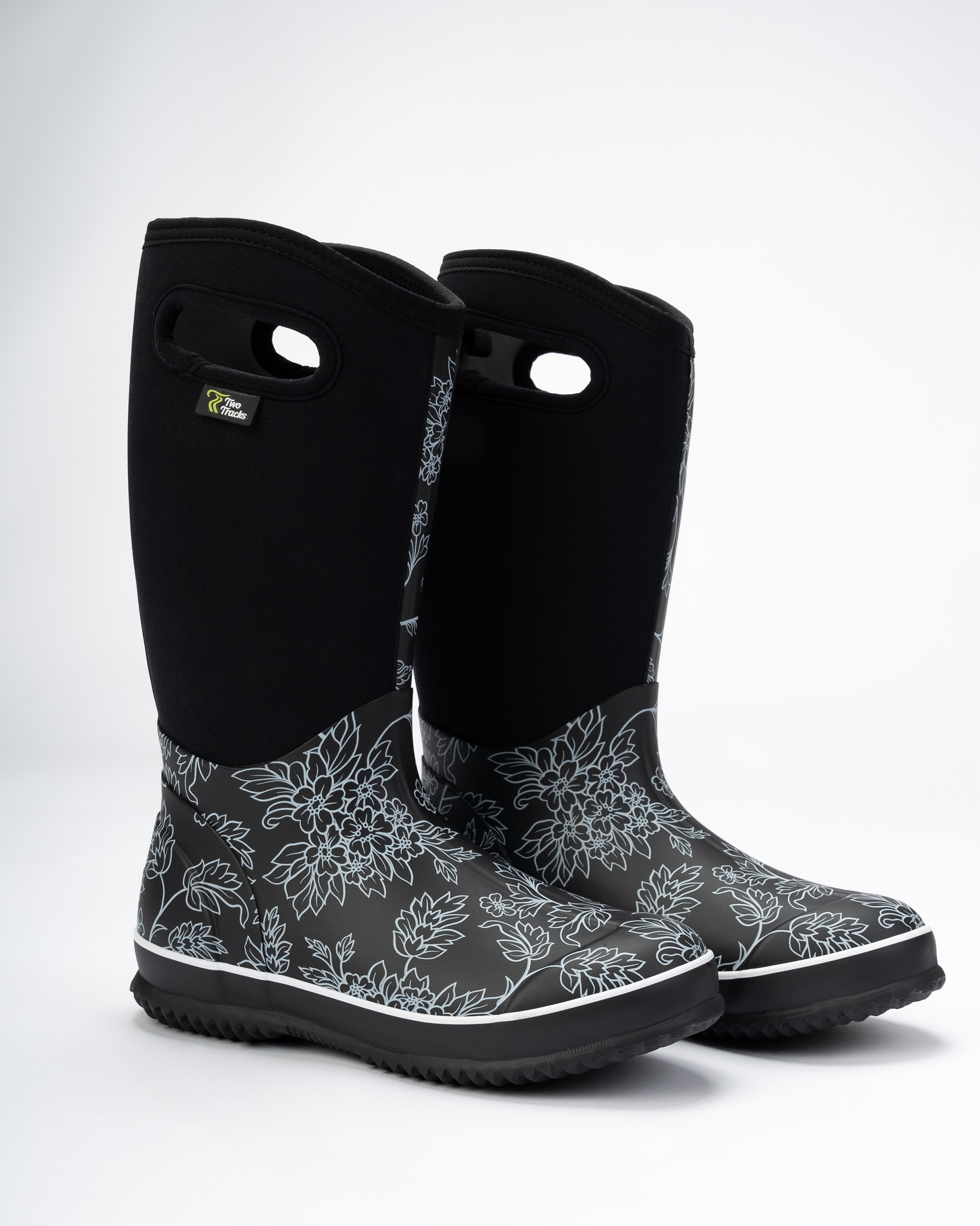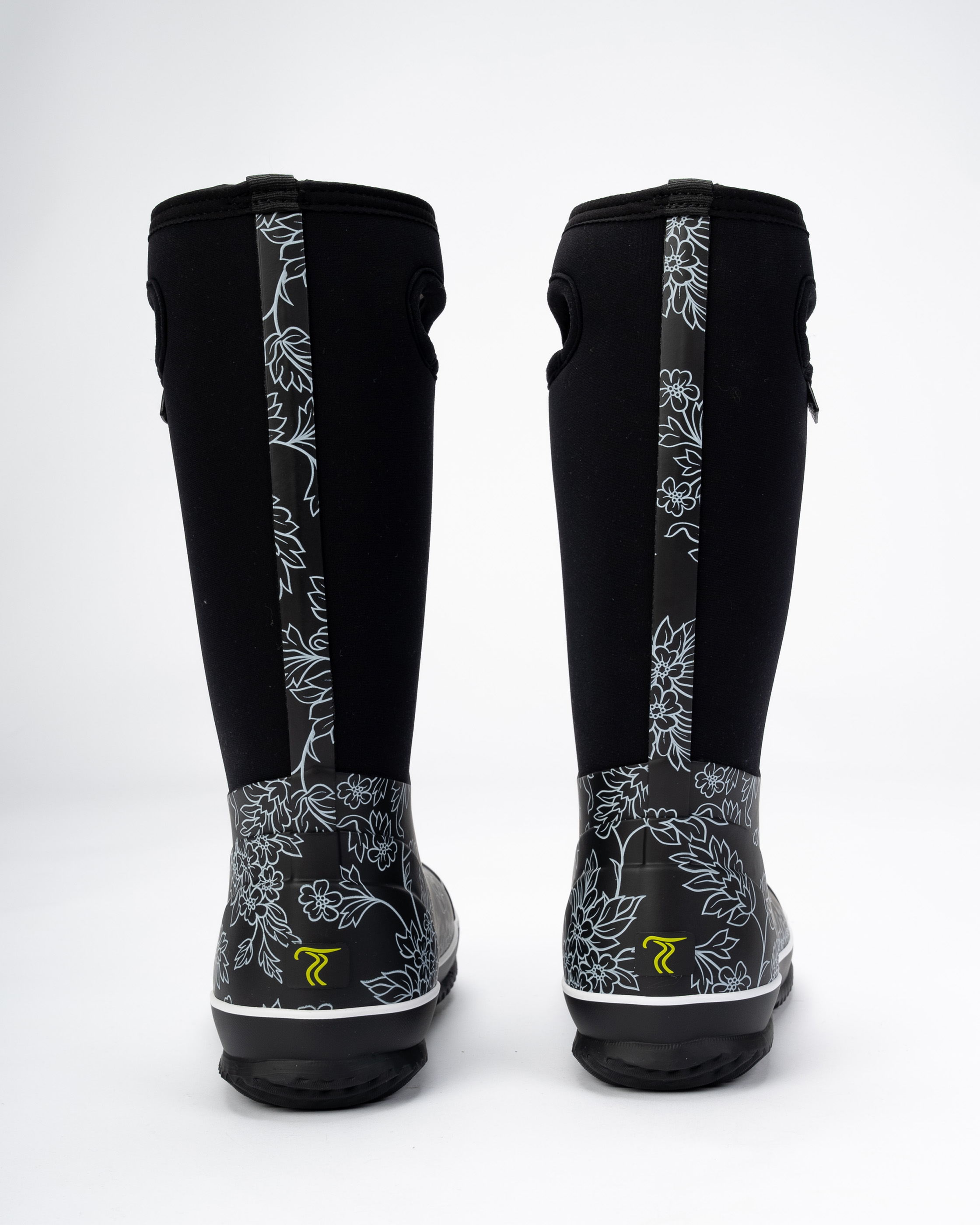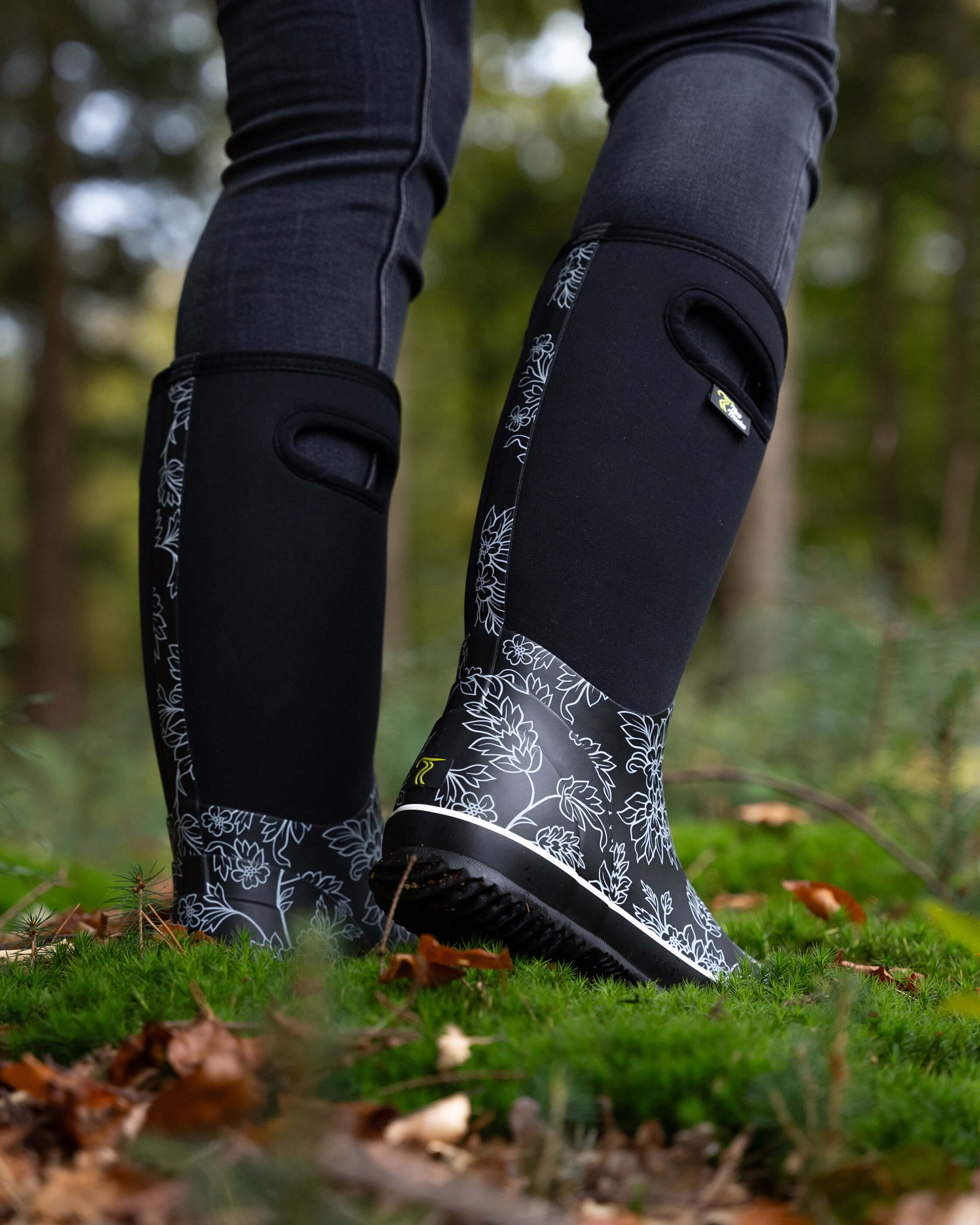 Das Unterteil aus vulkanisiertem Naturkautschuk sorgt für Langlebigkeit und Stabilität, während der Neopren-Schaft angenehme Wärme und Flexibilität bietet. Durch die schlanke Kalendersohle wirken die Stiefel besonders elegant und bieten gleichzeitig gute Trittfestigkeit auf nassem Untergrund. Dank der praktischen Grifflöcher am oberen Schaft gelingt das An- und Ausziehen ganz mühelos. Das dezente Muster am Unterteil harmoniert perfekt mit dem eleganten schwarzen Oberteil.
