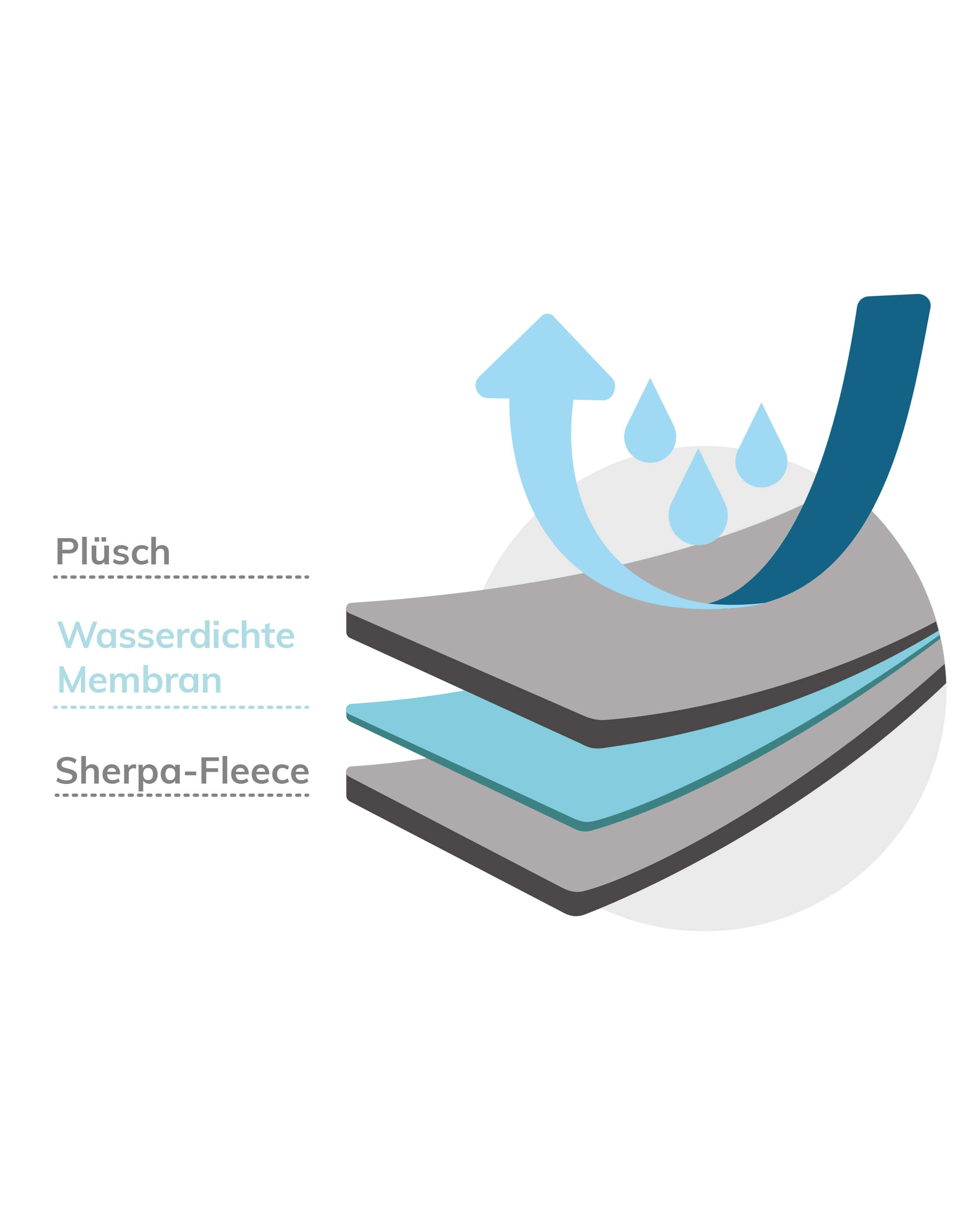 Schutz trifft Gemütlichkeit: Eine innovative, eingenähte Membran macht die Pearl-Decke absolut wasserfest. So bleiben Sofa und Körbchen zuverlässig trocken, während die Oberfläche flauschig weich bleibt – die ideale Kombination aus funktionalem Nässeschutz und maximalem Kuschelfaktor.