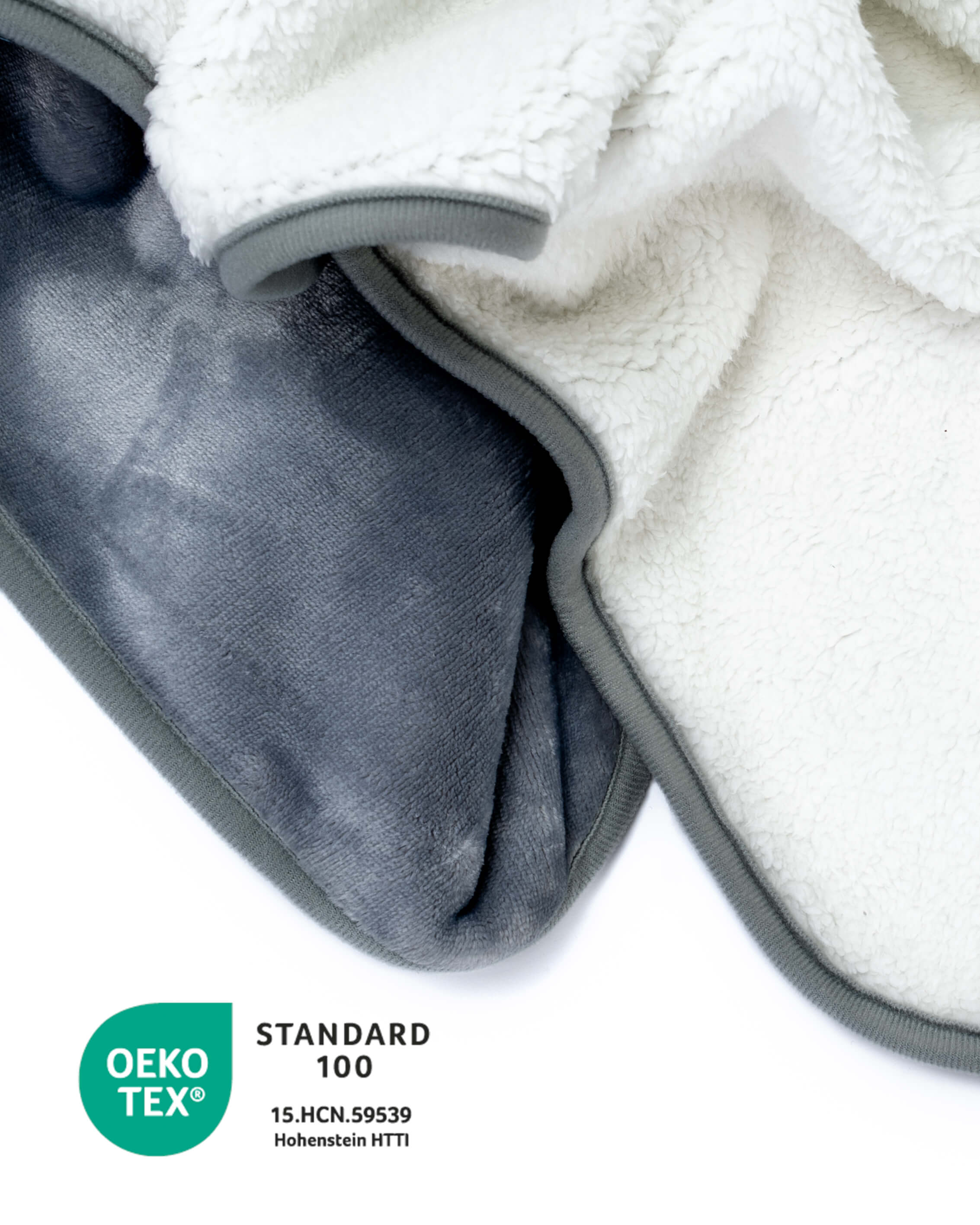Bei der Pearl-Decke musst du dich nicht zwischen Design und Nutzen entscheiden. Wir haben zwei besonders kuschelige Seiten kombiniert: Eine Seite besticht durch edlen, dunkelgrauen Plüsch, während die andere Seite aus hellem, flauschigem Sherpa-Fleece besteht. Diese Kombination macht die Decke zu einem echten Allrounder für jede Jahreszeit. Ob als wärmende Unterlage in der TPX-Hundebox, als weiche Schondecke auf dem Doppelbett oder als mobiler Liegeplatz im Auto – dein Hund wird den extra hohen Kuschelfaktor lieben. Dabei legen wir höchsten Wert auf Sicherheit und Qualität: Die Decke ist nach OEKO-TEX Standard 100 zertifiziert und somit nachweislich schadstoffgeprüft. So kannst du dir sicher sein, dass dein Hund auf einer gesundheitlich unbedenklichen und besonders hautfreundlichen Unterlage schlummert. Dank der hochwertigen Verarbeitung bleibt die Decke formstabil und bietet deinem Vierbeiner jederzeit einen gemütlichen Rückzugsort.