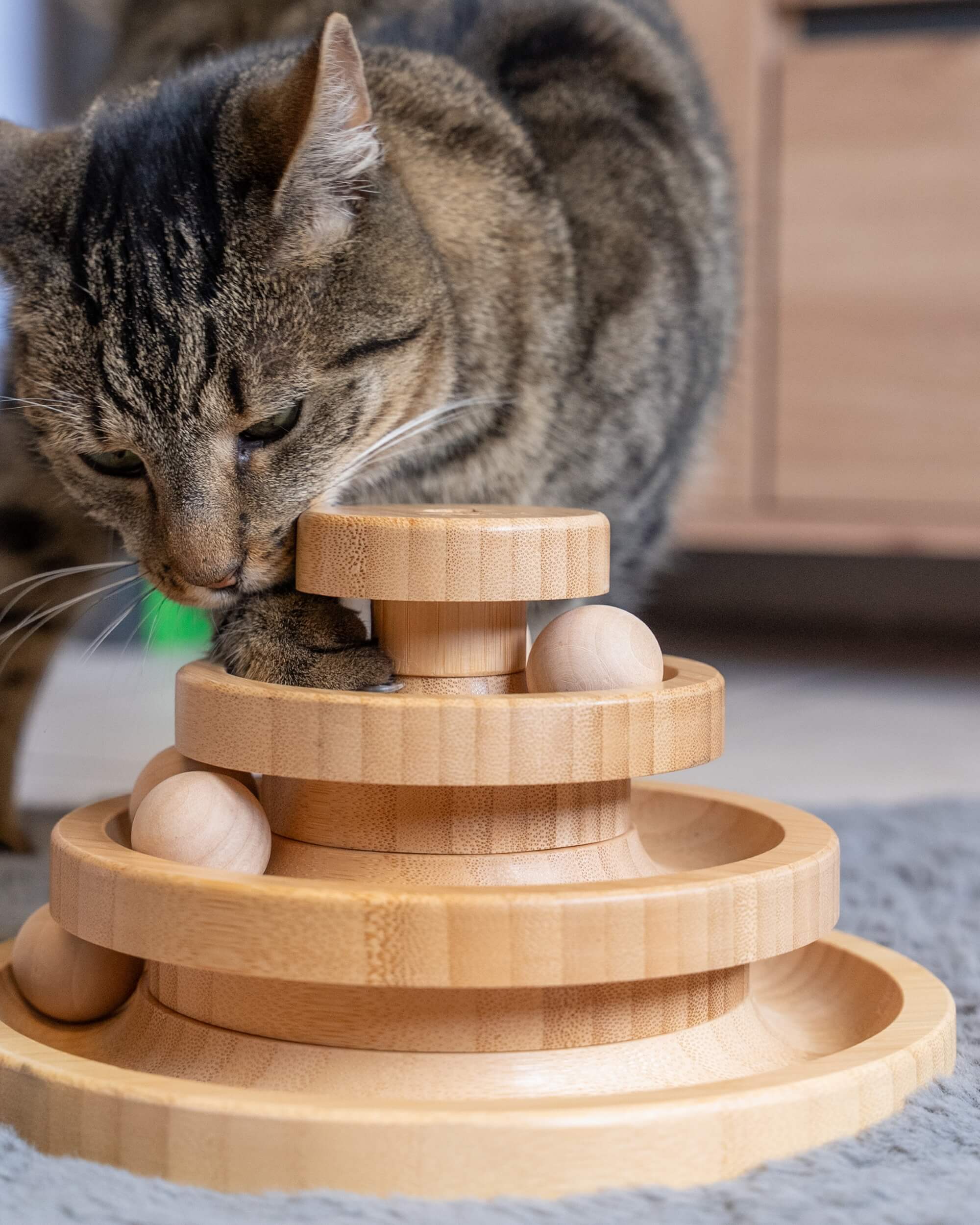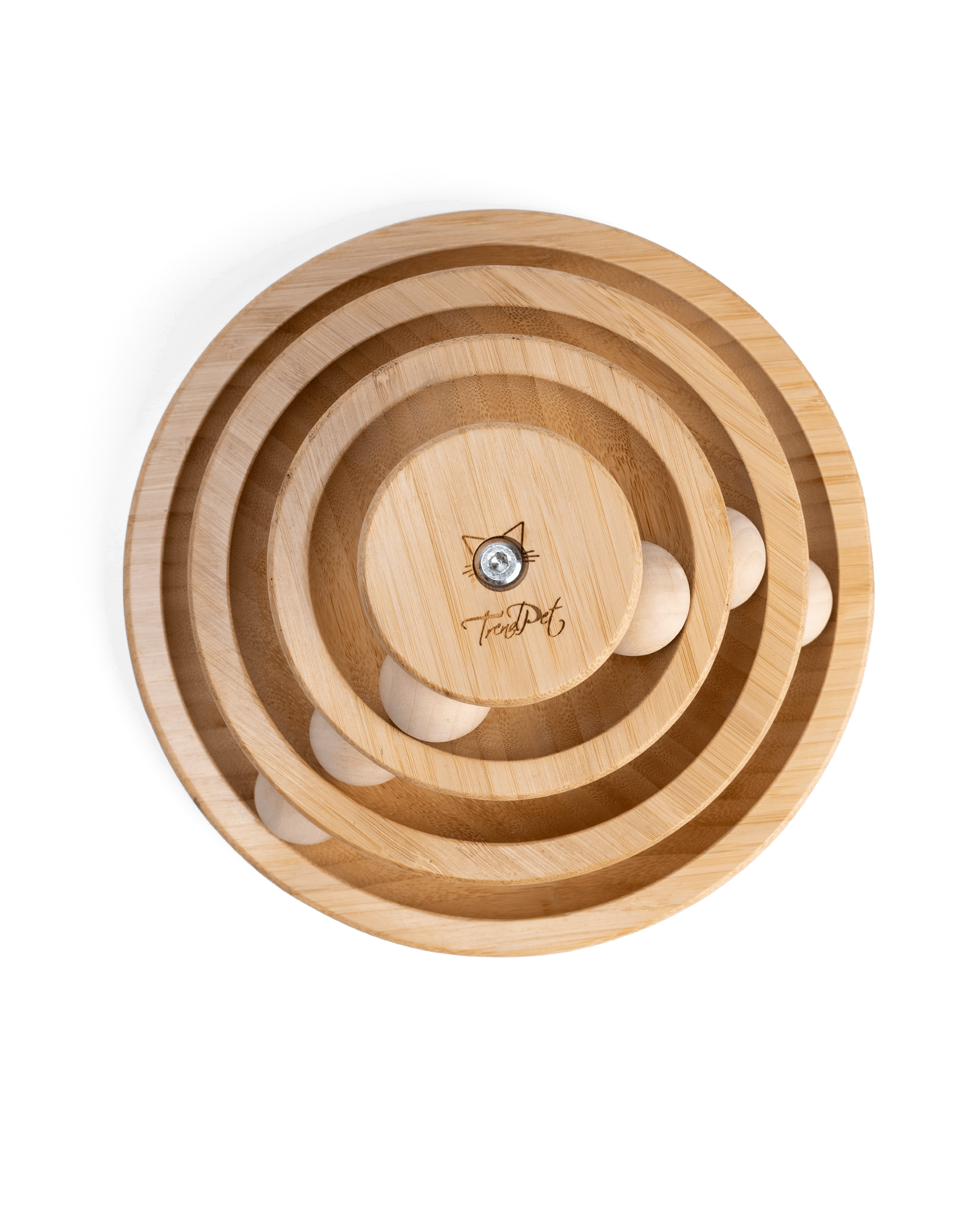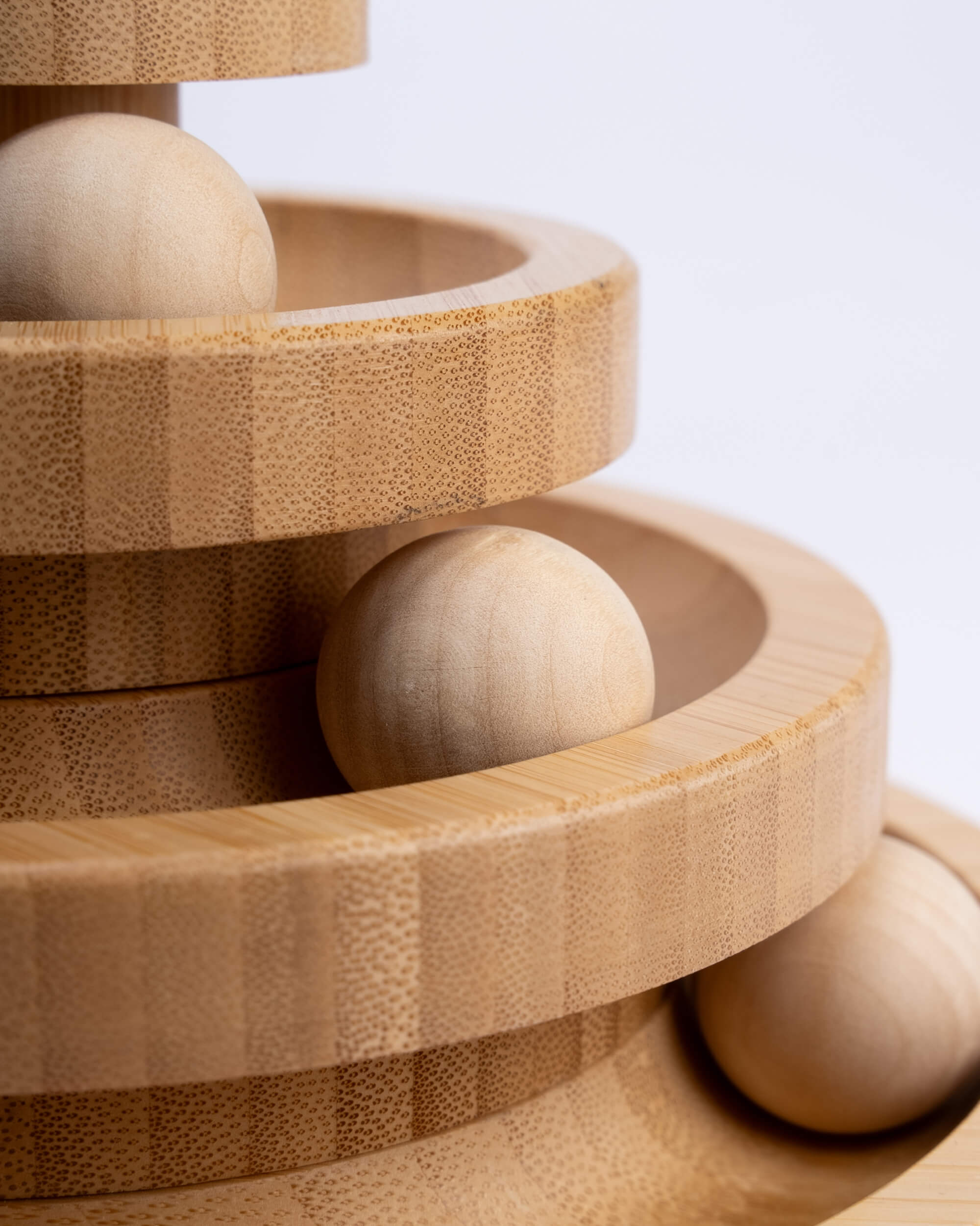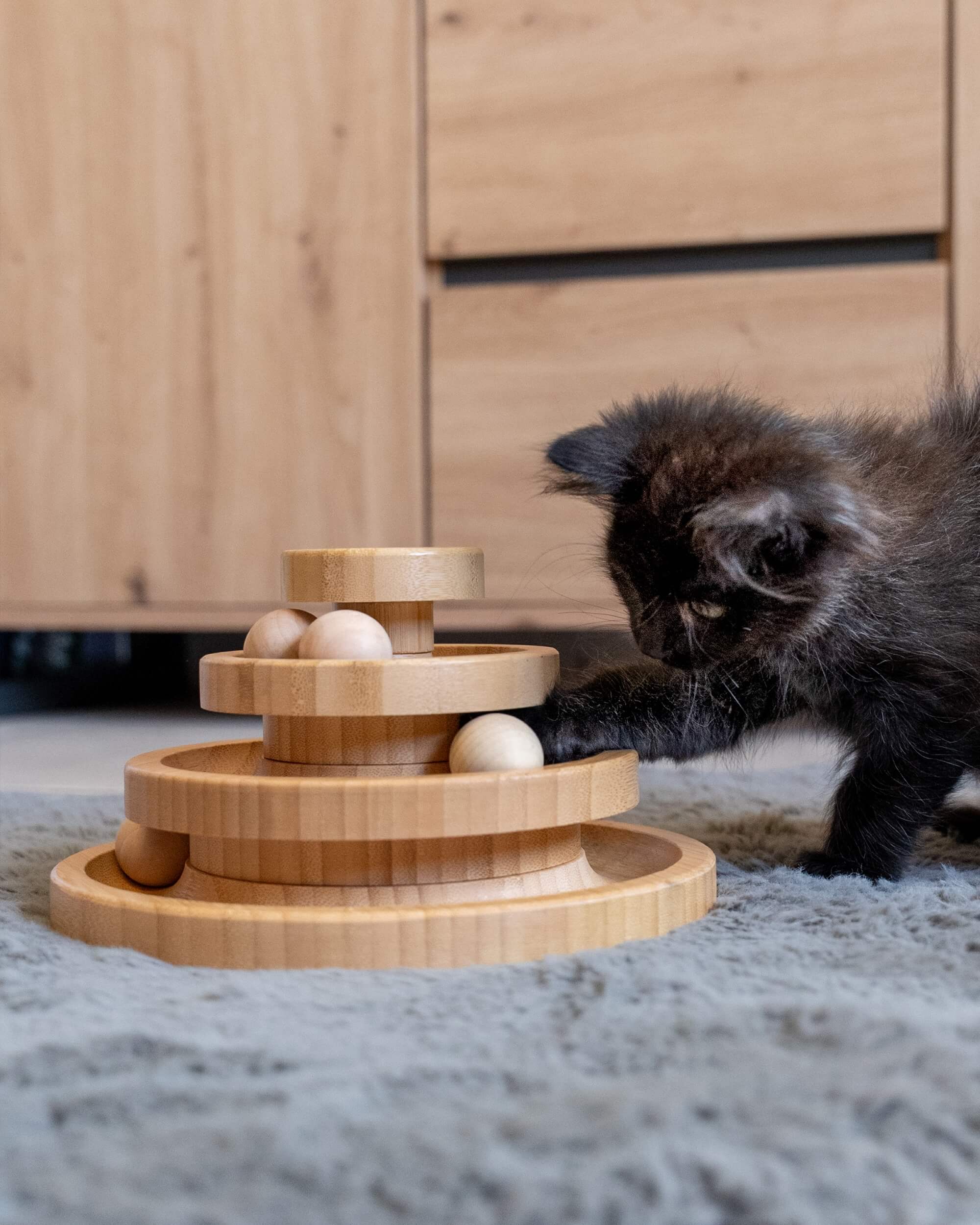 Auf drei Ebenen rollen jeweils zwei massive Holzkugeln in einer geschlossenen Bahn – ein sanfter Pfotenstupser genügt, und das Spiel beginnt. Die fließende Bewegung der Kugeln spricht den natürlichen Jagdinstinkt deiner Katze an und sorgt für stundenlangen Spielspaß – egal ob junges Kätzchen oder entspannter Senior-Tiger.