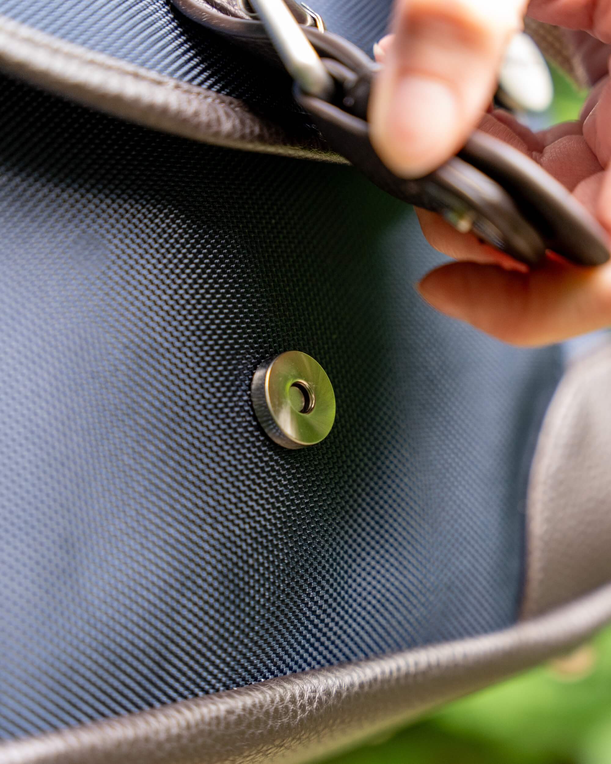 - GFronttasche, doppelt gesichert durch Frontklappe (mit Magnetverschluss) und Reißverschluss