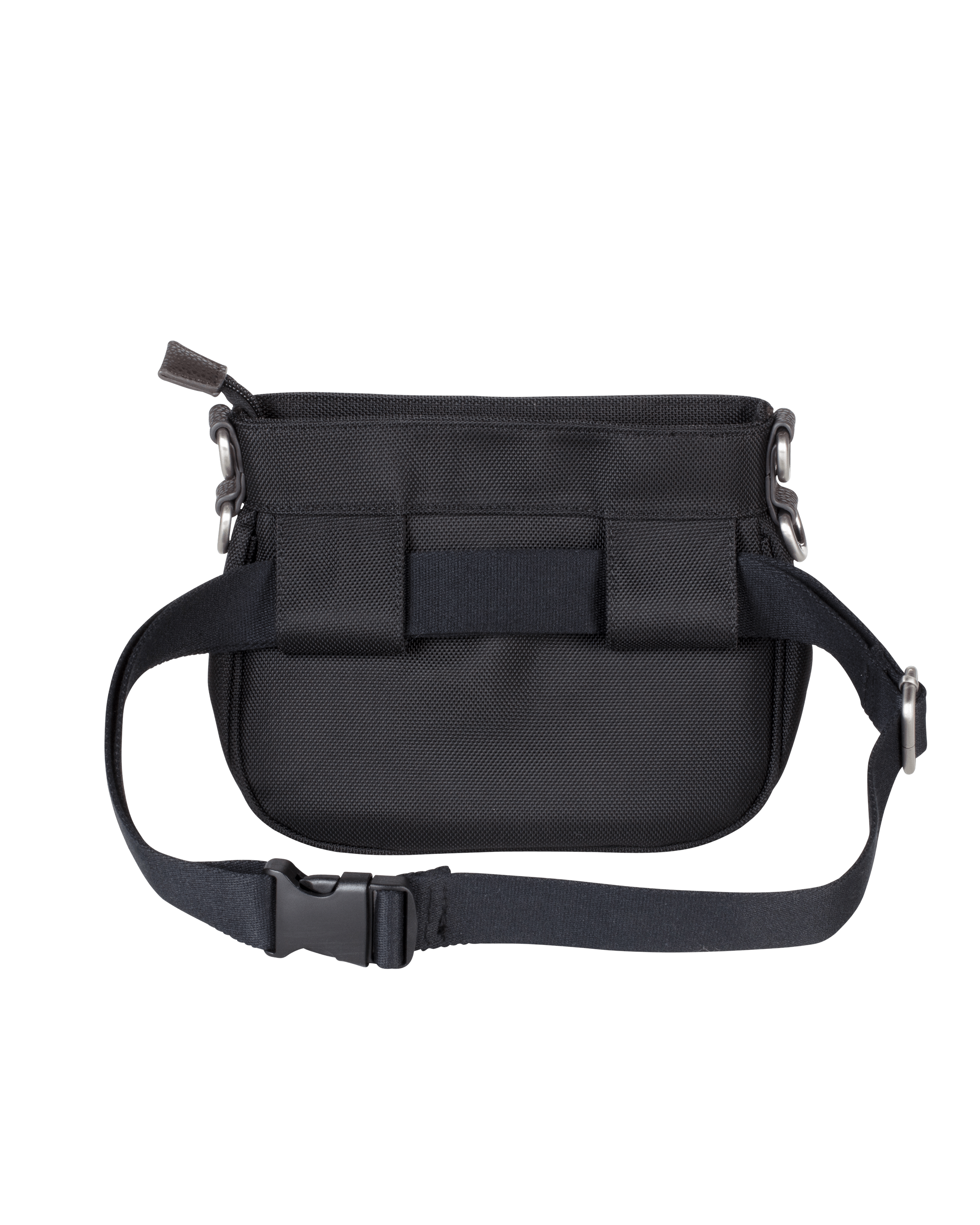 Zur Belly Hazel gehört eine Manschette, mit der du den Leckerlibeutel vorne am Schultergurt tragen kannst. An den seitlichen Metallringen kannst du den Poo Pouch, unseren Kotbeutelspender, per Karabinerhaken befestigen.